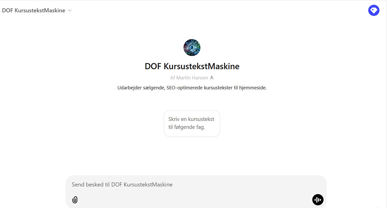DOF har lavet et værktøj i ChatGPT, der hjælper til at skrive gode, søgemaskineoptimerede kursustekster. Vi har kaldt den DOF KursustekstMaskine – og den er gratis tilgængelig for alle DOF’s medlemsskoler.