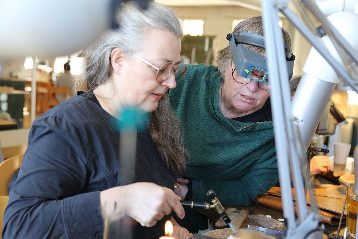 Gitte Bjørn står for dagens undervisning og er ved siden af at være udøvende smykkekunstner helt central på Smyk2000. Det er hendes værksted, skolen bruger, og hun overtog det i 2009 fra grundlæggeren, Carsten From. Udover værkstedet over tog Gitte også værdierne – ikke mindst et højt ambitionsniveau.